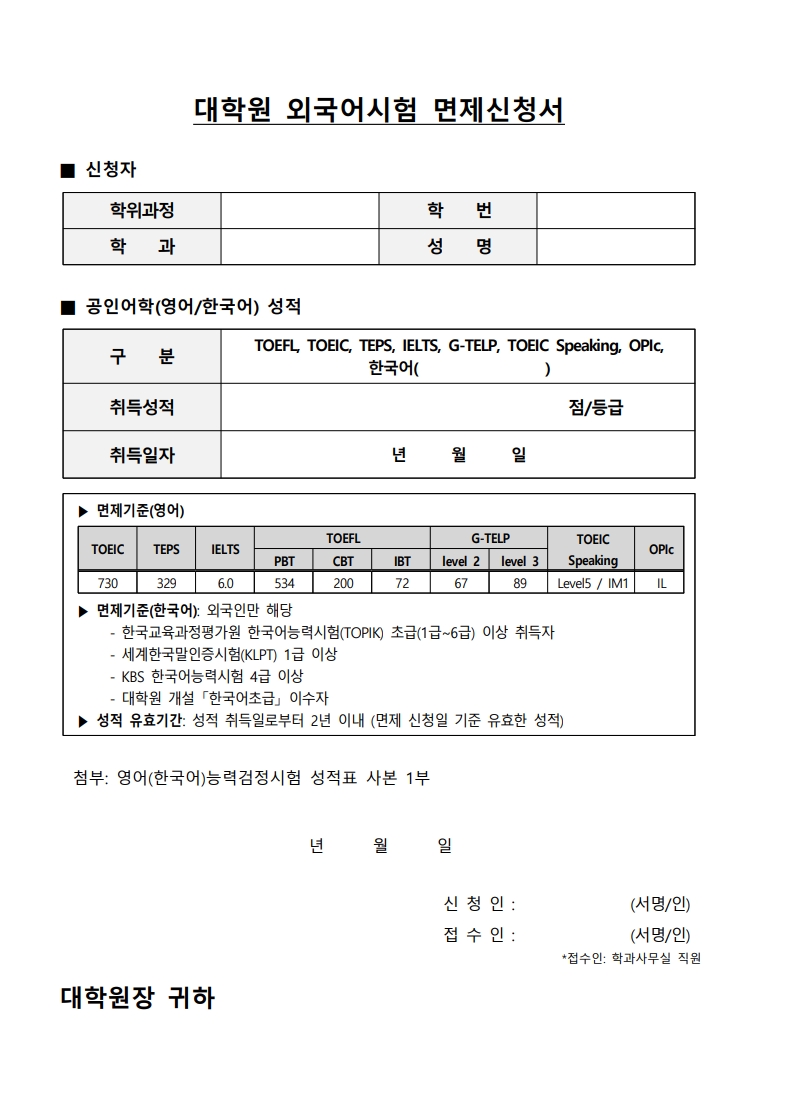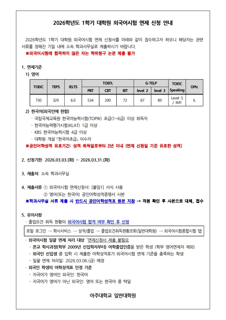 2026학년도 1학기 대학원 외국어시험 면제 신청서를 아래와 같이 접수하고자 하오니 해당자는 관련 서류를 정해진 기일 내에 소속 학과사무실로 제출하시기 바랍니다.